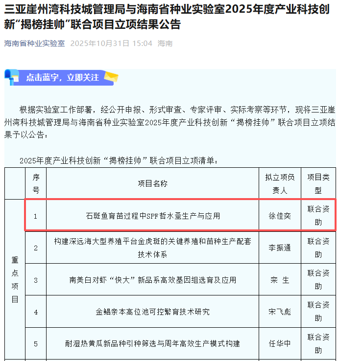 近日,海南省种业实验室与三亚崖州湾科技城管理局联合发榜企业为推动解决海南热带高效农业发展的关键技术难题,共同发榜2025年度产业科技创新“揭榜挂帅”项目。我院徐佳奕老师作为项目牵头人联合集美大学揭榜的《石斑鱼育苗过程中SPF哲水蚤生产与应用》项目获批立项。